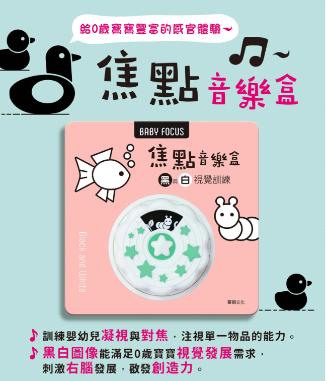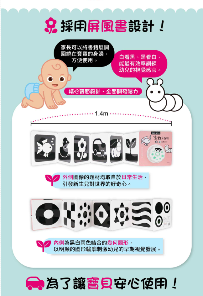 ✭黑白圖像能滿足0歲寶寶視覺發展需求,刺激右腦發展,啟發創造力。