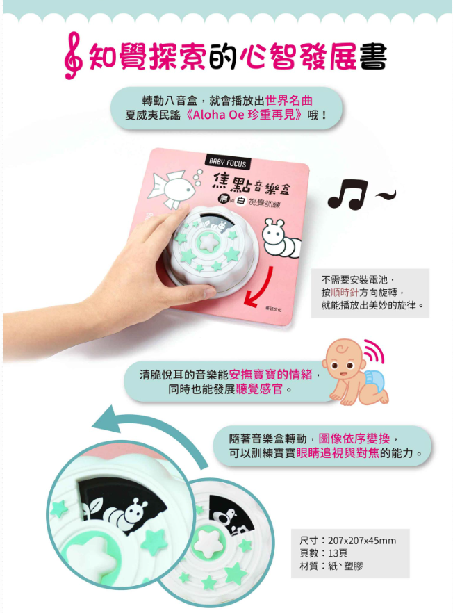 ✭隨著音樂盒轉動,還有黑白圖像依序變換,可以訓練寶寶眼睛追視與對焦的能力。