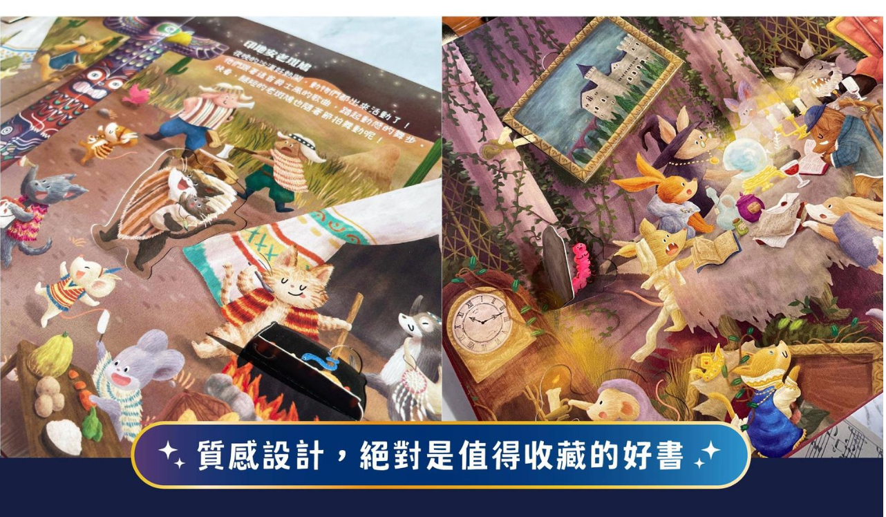 書封使用質感滿滿的仿布紋材質,搭配燙金設計字體印在上面,呈現出高貴帶有典雅的獨特風格,讓書本不只適合孩子閱讀及聆聽,當作收藏品也十分適合!