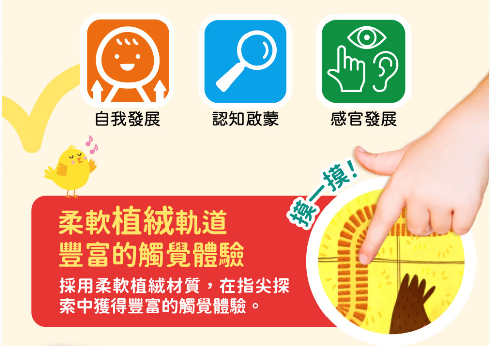 🔸視覺+聽覺+觸覺,全面感官啟蒙:植絨軌道搭配動物叫聲,帶來豐富的感官體驗。